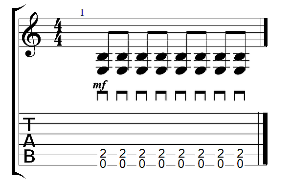 В нотации даунстрок обозначается символом удара медиатором вниз.