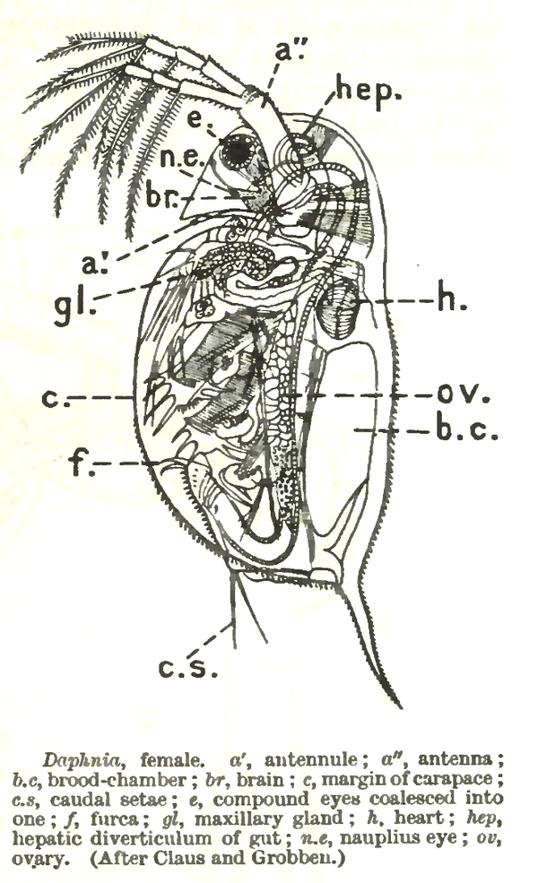 Дафния магна (Daphnia magna), самка — до 6 мм, самец — до 2 мм, новорождённые — 0,7 мм. Созревают в течение 10—14 суток. Помёты через 12—14 суток. В кладке до 80 яиц (обычно 20—30). Продолжительность жизни — до 3-х месяцев.