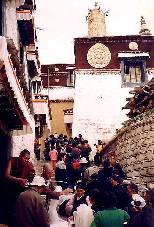 В Тибете стены храмов сооружались из тёсаного камня или сырцового кирпича без связующих растворов. Это определяло характерную особенность тибетской архитектуры: наклонность внутрь наружных плоскостей стен.