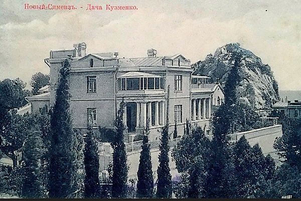 24 января 1904 года инженер-железнодорожник Василий Михайлович Кузьменко приобрёл у владельца Нового Симеиза И. С. Мальцова дачный участок № 5 в западной части Нового Симеиза площадью 319 квадратных саженей (примерно 14,1 сотки), расположенный на крутом горном склоне к морю «с великолепным видом»[1][2]. К середине 1905 года Василий Михайлович по собственному проекту построил двухэтажную дачу на 14 комнат «для семьи, постояльцам комнаты не сдавались»[3] — первое строение в этой части Нового Симеиза. Склон у почтового тракта был крутым и скалистым — пришлось выравнивать площадку, срезая склон и укреплять место под дом подпорной стеной. Здание, тяготеющее к стилю неоклассицизма, украшено античными архитектурными элементами: колоннами, портиками, просторными открытыми балконами и имеет сложный профиль в 1—2 этажа. У дачи 4 парадных входа с каждой стороны, на участке был ещё небольшой флигель и небольшой парк в южной части[4].