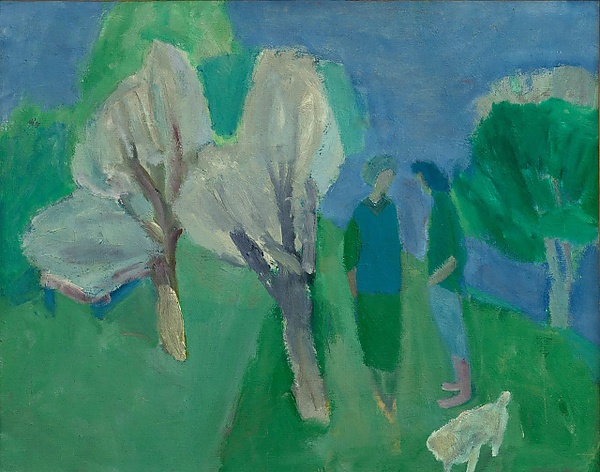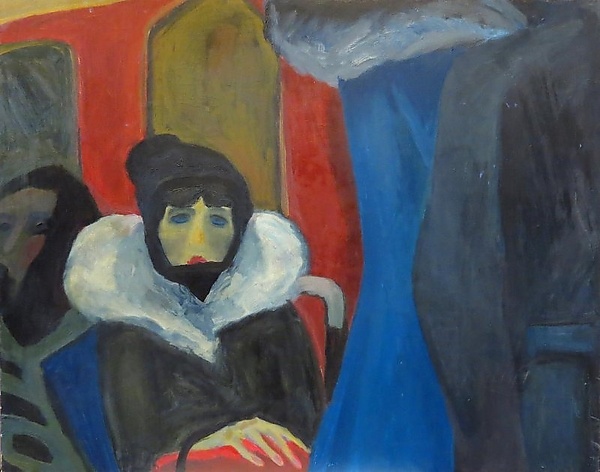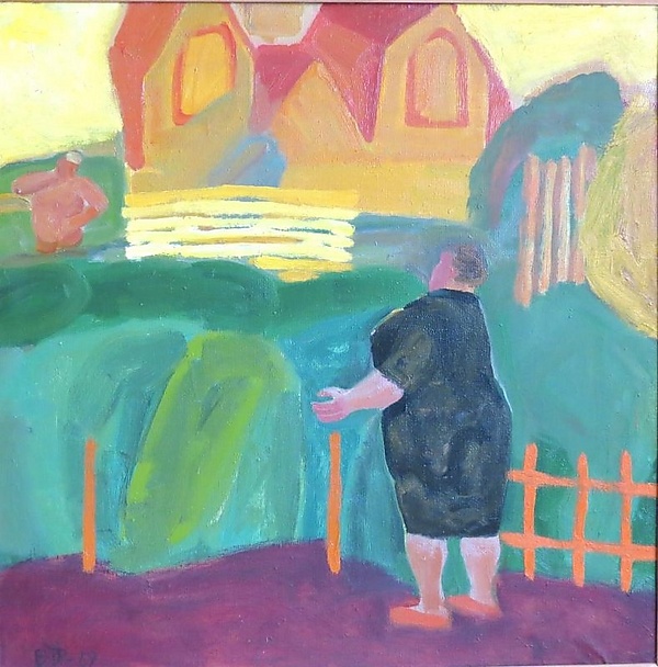 На переднем плане композиции изображена женщина крупного телосложения, обращённая боком влево, с вытянутой вперёд левой рукой. Она одета в чёрное платье с коротким рукавом. На заднем плане слева заметна мужская фигура, видимая до колен, а справа находятся два дома, соединённые между собой более низким строением с треугольной крышей. Фон картины составляют зелёные насаждения. Работа выполнена в традициях бытового жанра, с акцентом на повседневные сцены и окружающую архитектуру.
