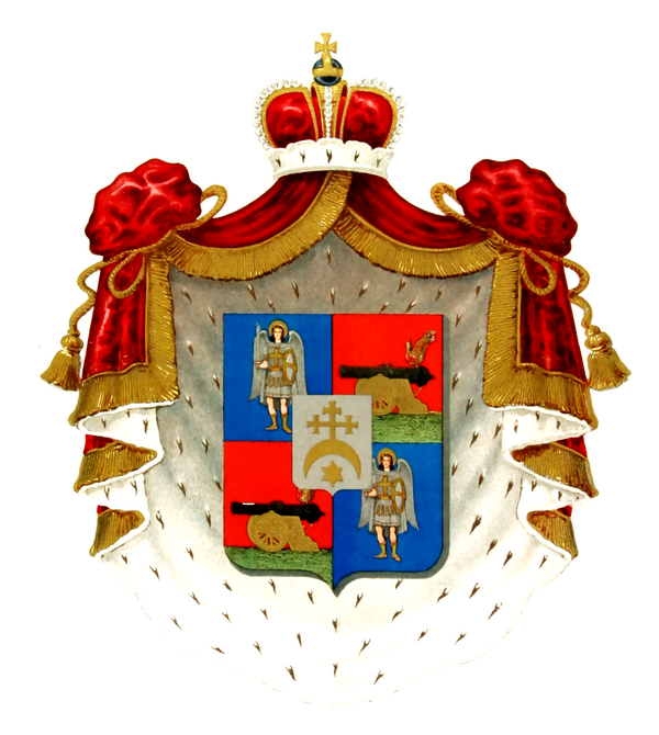 Описание герба: Выдержка из Общего гербовника В щите, разделённом на четыре ровные части, посередине находится малый щиток, в котором изображены в белом поле: крест, шестиугольная звезда и между ними полумесяц, рогами обращённый вниз (ср. Дашкевичи). В первой и четвёртой части — в голубом поле ангел в серебрянотканой одежде, держащий в правой руке обнажённый серебряный меч, а в левой — золотой щит. Во второй и третьей части — в красном поле чёрная пушка на золотом лафете, а на пушке сидит райская птица. Щит покрыт мантией и шапкой, принадлежащих княжескому достоинству. Герб рода князей Дашковых внесен в Часть 1 Общего гербовника дворянских родов Всероссийской империи, стр. 10[1] |