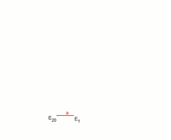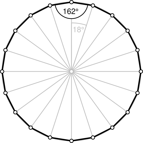 Так как , правильный двадцатиугольник можно построить при помощи циркуля и линейки, или при помощи разбиения сторон правильного десятиугольника, или двойного разбиения сторон правильного пятиугольника.