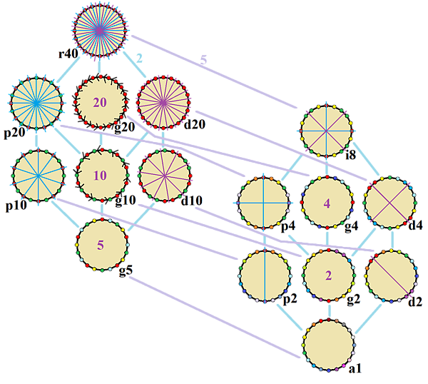 В данной диаграмме, предложенной Джоном Конвеем, каждая подгруппа симметрии обозначена буквой и собственным порядком.[1] Вся группа симметрий названа , а тривиальная подгруппа, соответствующая полному отсутствию симметрии, обозначена как . Диэдрические группы симметрии делятся на те, оси симметрий которых проходят только через вершины ( — diagonal), только через рёбра ( — perpendicular) или через и то, и другое (такая подгруппа обозначена буквой ). Циклические симметрии обозначены буквой (англ. gyration) и своим порядком.