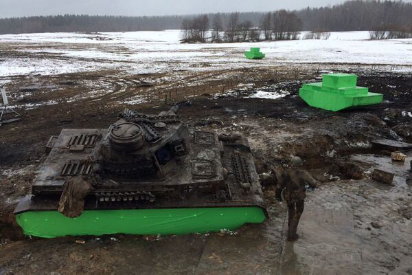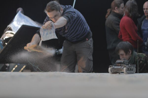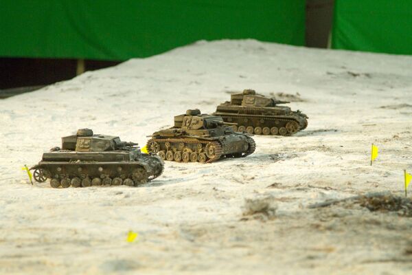 Такой подход требовал определённой техники съёмок. Для того, чтобы перемещения игрушечного танка были похожи на перемещения настоящего, необходимо было снимать его в четыре раза быстрее, а затем замедлить полученные кадры. Камеру, соответственно, нужно было перемещать в четыре раза быстрее, чем на поле, что невозможно сделать руками. Поэтому в павильонных съёмках для управления камерой операторы использовали роботизированную руку KUKA Agilus, предоставленную и запрограммированную с помощью специалистов НИИ робототехники[85]. Для съёмок крупным планом был построен полноразмерный макет танка PzKpfw IV[86], боевое отделение которого было воссоздано на «Ленфильме» как отдельная капсула на пружинах, что позволяло добиться реалистичной качки при съёмках. В настоящее время макет хранится в музее карельского перешейка в Выборге, а одна из малых моделей стала частью коллекции короля Иордании, который был заинтересован фильмом[87].