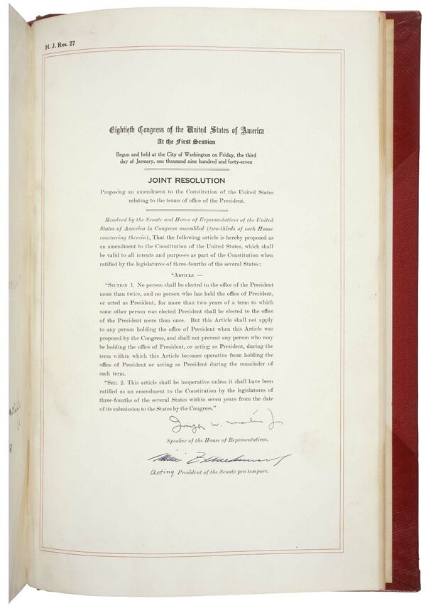 Раздел 1. Никто не может быть избран на должность Президента более чем два раза, а лицо, занимавшее должность президента или действовавшее в качестве президента в течение более двух лет от срока, на который был избран президентом другой человек, не может избираться на должность Президента более чем один раз. Это положение не распространяется на лицо, занимающее пост президента в период, когда данная поправка была предложена Конгрессу, и не препятствует любому лицу, которое может занимать пост президента или исполняющего обязанности президента, в течение срока, в пределах которого данная статья вступает в силу, сохранять пост президента или исполняющего обязанности президента в течение оставшегося срока.
