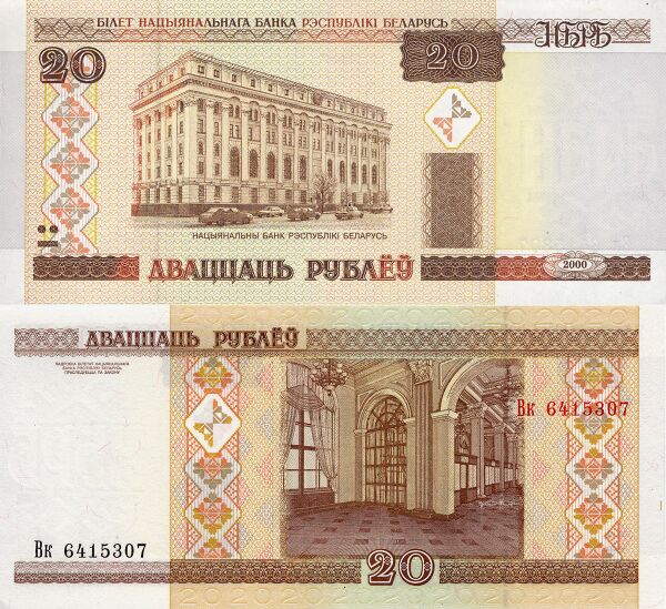 В Белоруссии денежный знак 20 рублей печатается с 1992 года в виде банкноты, но также, выпускаются памятные и юбилейные серебряные монеты[1].
