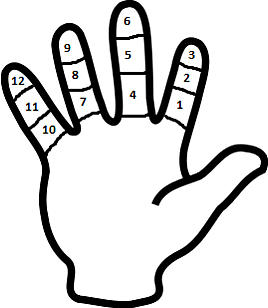 Происхождение 12-ричной системы счисления не вызывает сомнений — это пальцевой фаланговый счёт, при котором большим пальцем руки считают каждую фалангу четырёх пальцев той же руки[1].