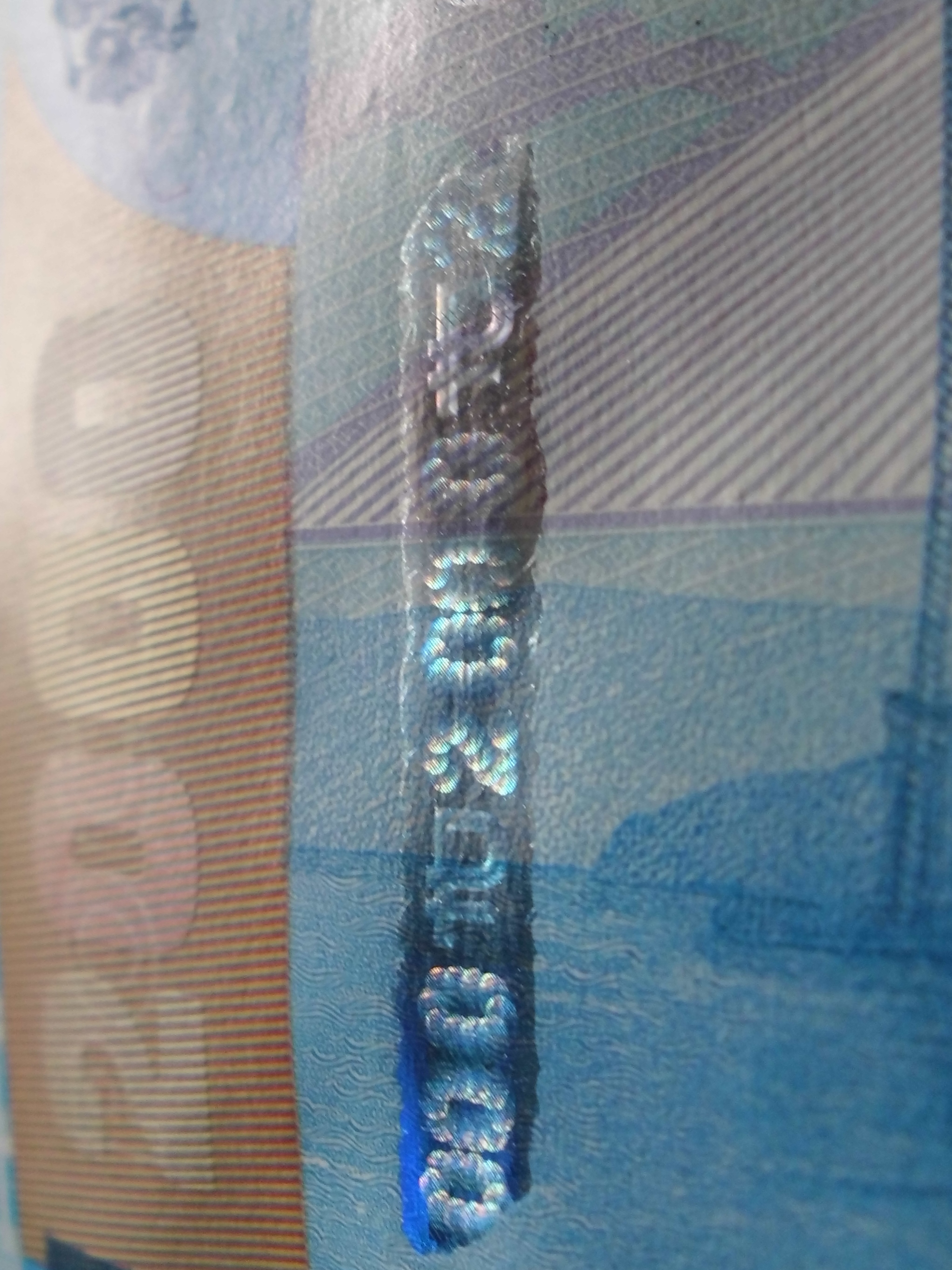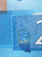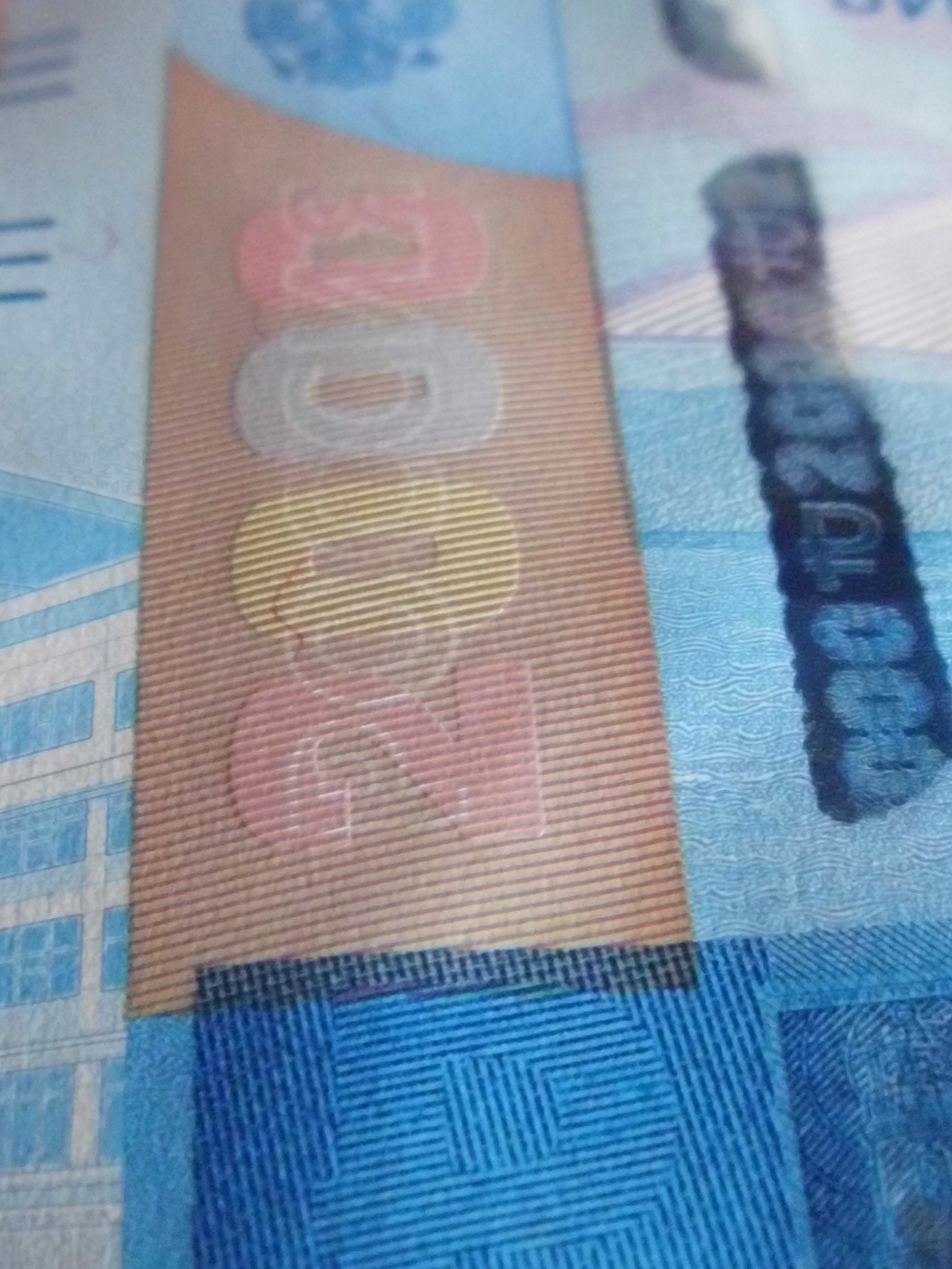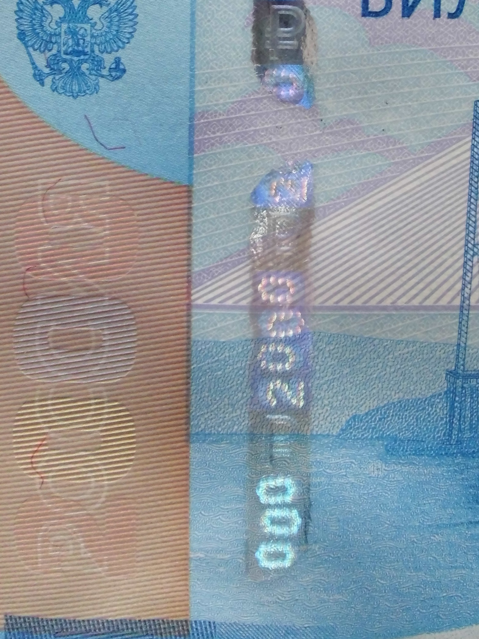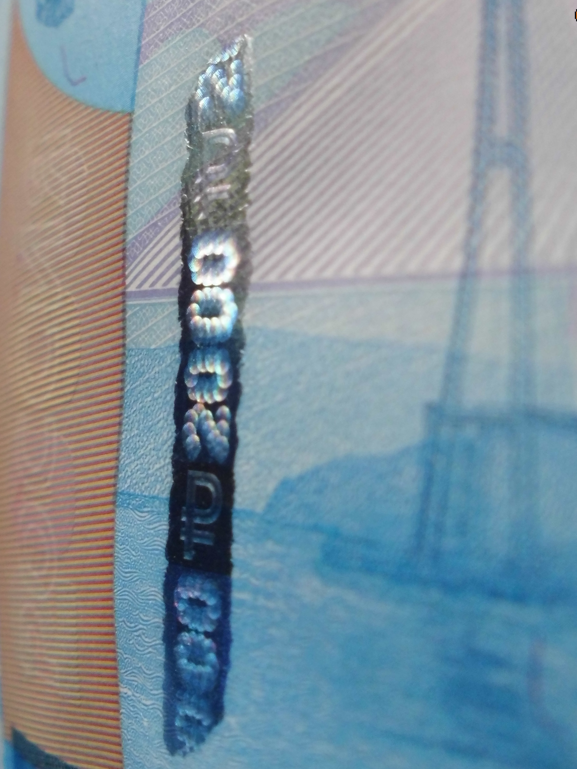 - — на металлизированной ленте под прямым углом видны чередующиеся тёмные символы «₽» и светлые числа «2000», при изменении угла взгляда каждые цифры чисел «2000» «движутся» в разные стороны, при некоторых углах зрения каждое число «2000» заменяется двумя символами «₽» на радужном фоне;