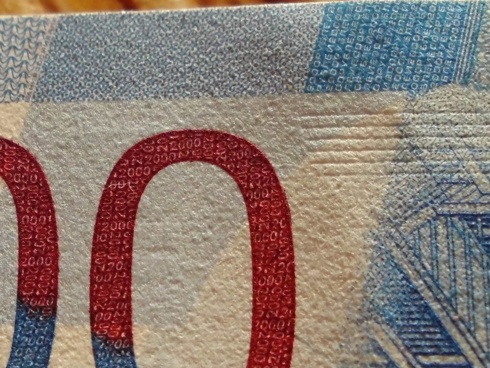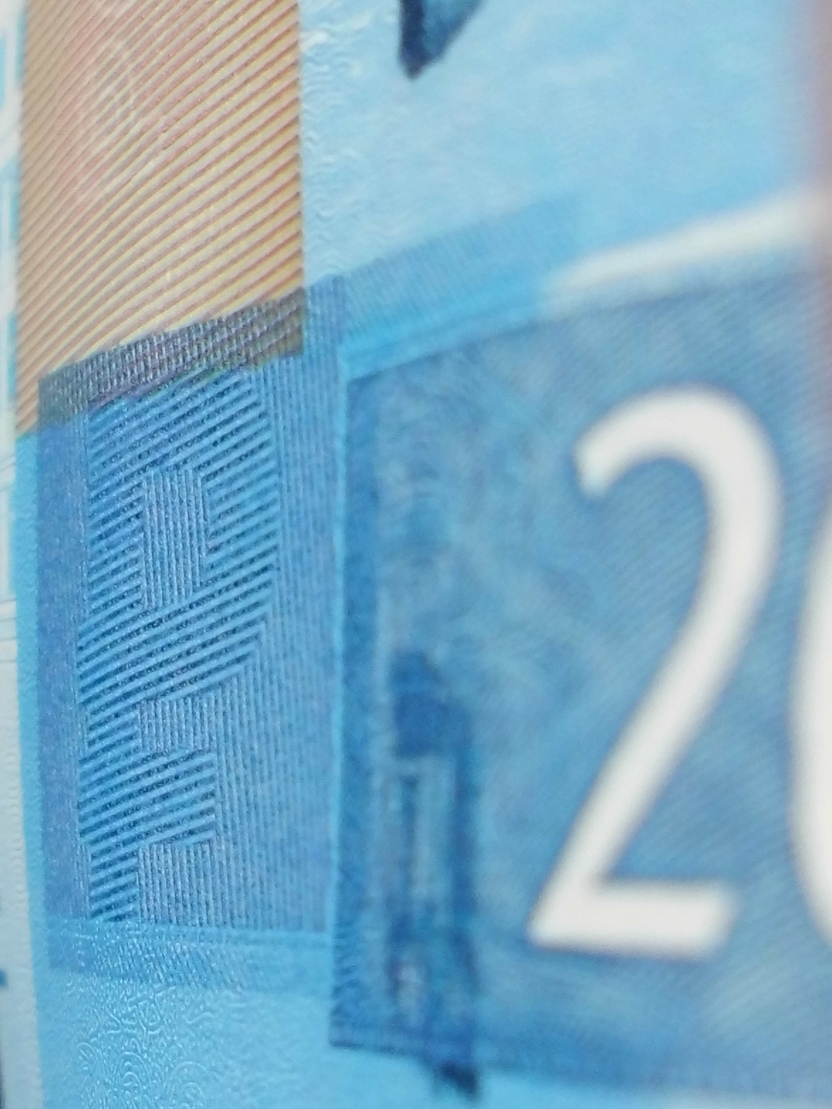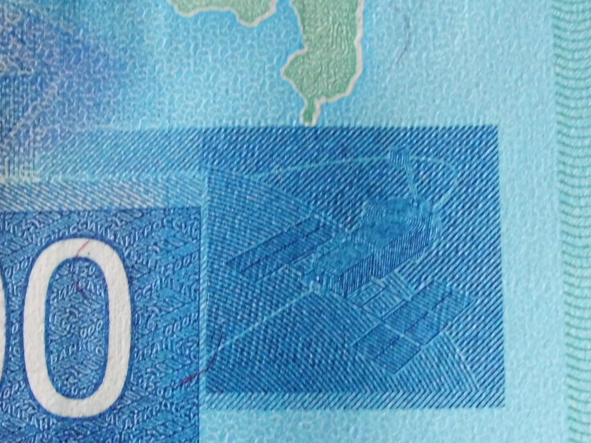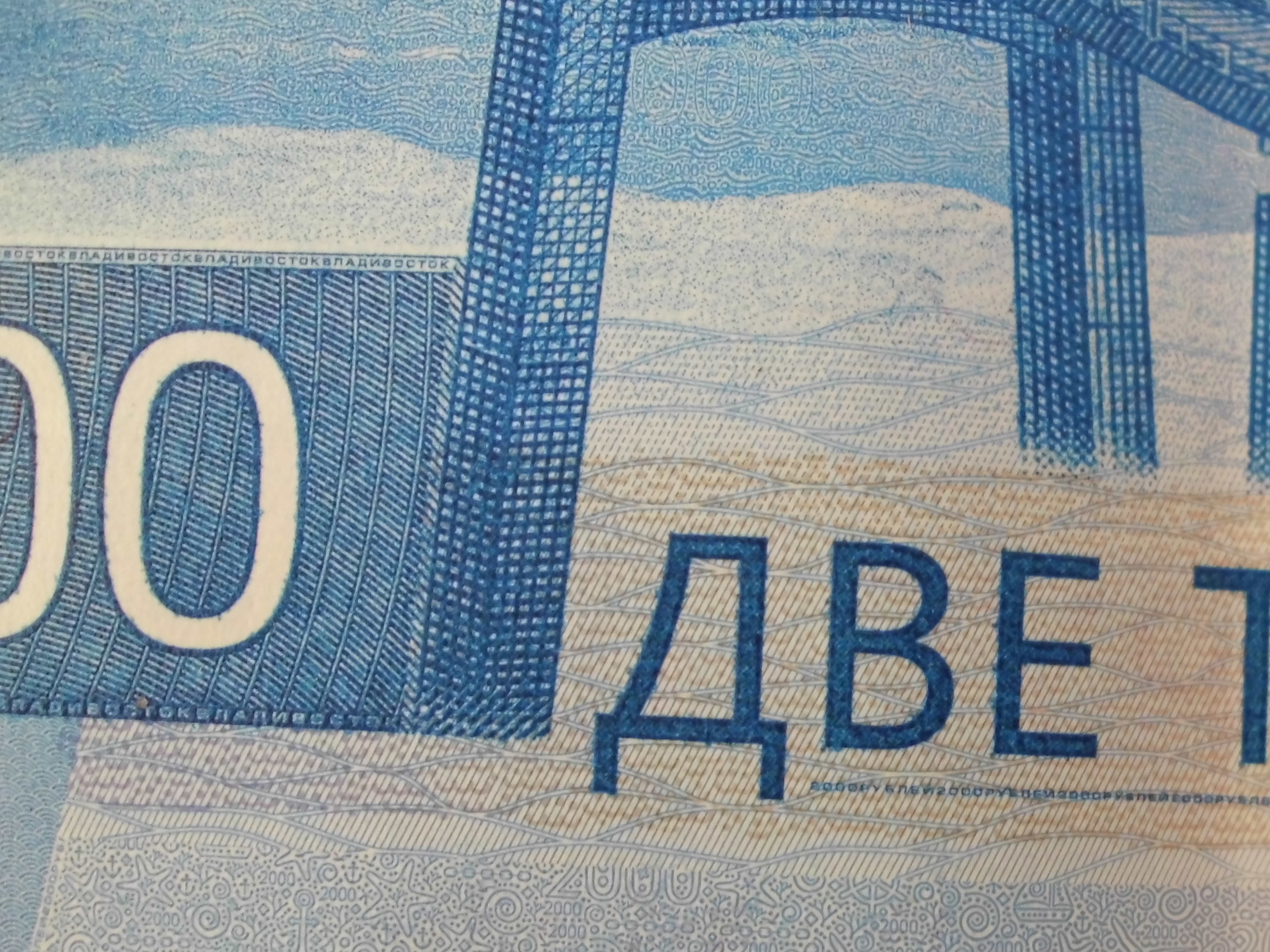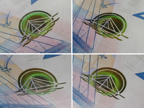 - — на металлизированной ленте под прямым углом видны чередующиеся тёмные символы «₽» и светлые числа «2000», при изменении угла взгляда каждые цифры чисел «2000» «движутся» в разные стороны, при некоторых углах зрения каждое число «2000» заменяется двумя символами «₽» на радужном фоне;
