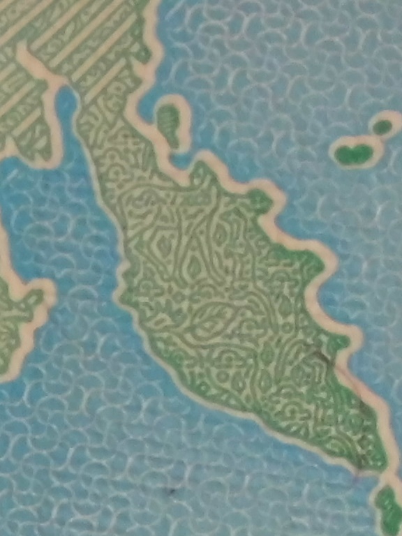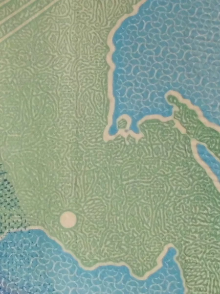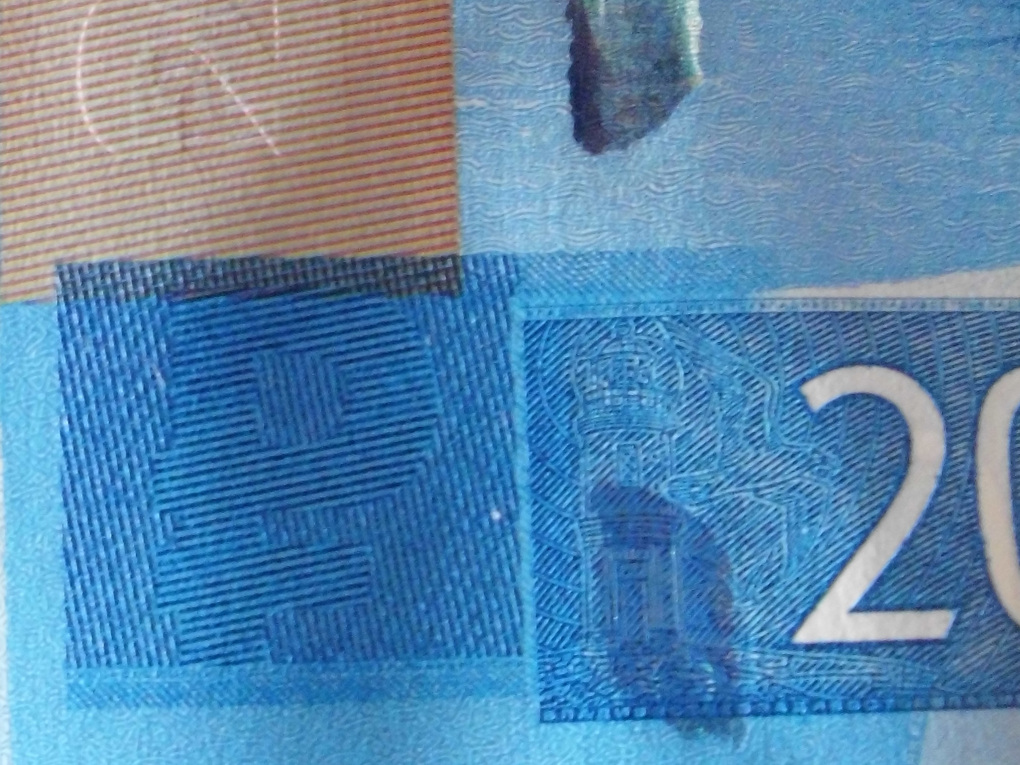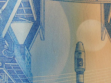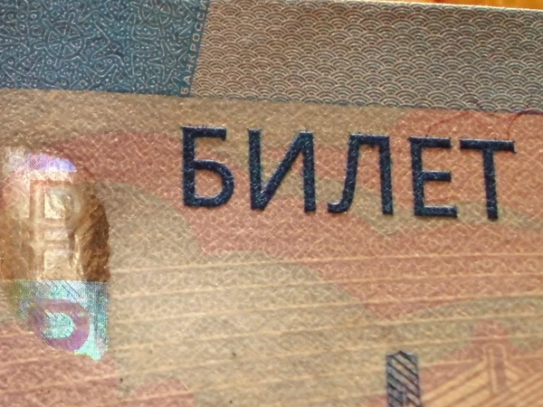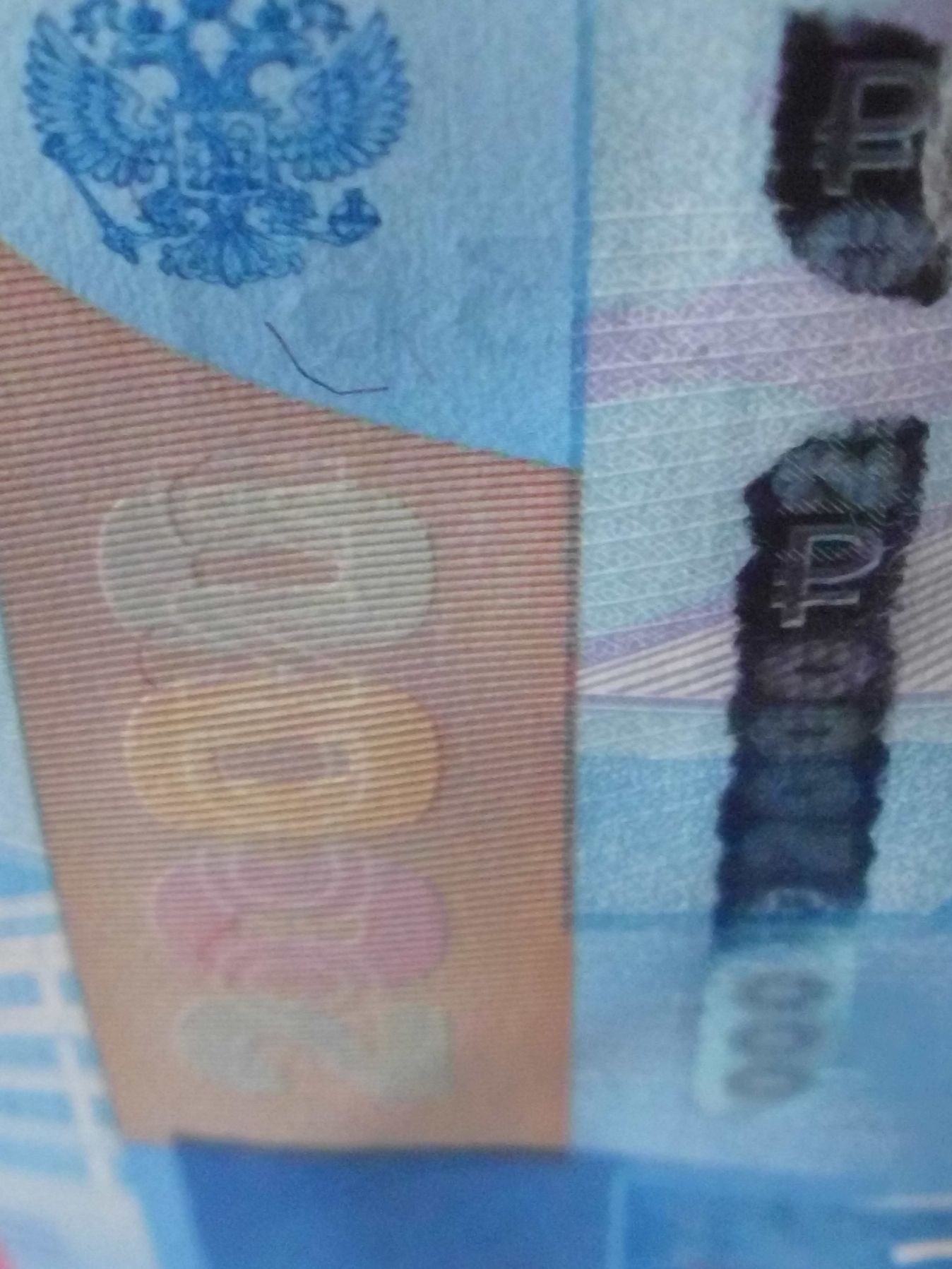 - — скрытое изображение символа рубля с КИПП-эффектом, тёмный или светлый символ становится виден на светлом или тёмном фоне при взгляде под острым углом к плоскости банкноты с разных сторон;