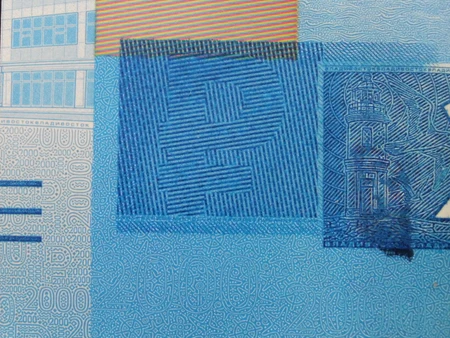 - — цветопеременная надпись на лицевой стороне: при взгляде под острым углом к плоскости банкноты смена цветов цифр одного из трёх номиналов «2000» (на однотонном заштрихованном фоне с контурной надписью «РОССИЯ»);
