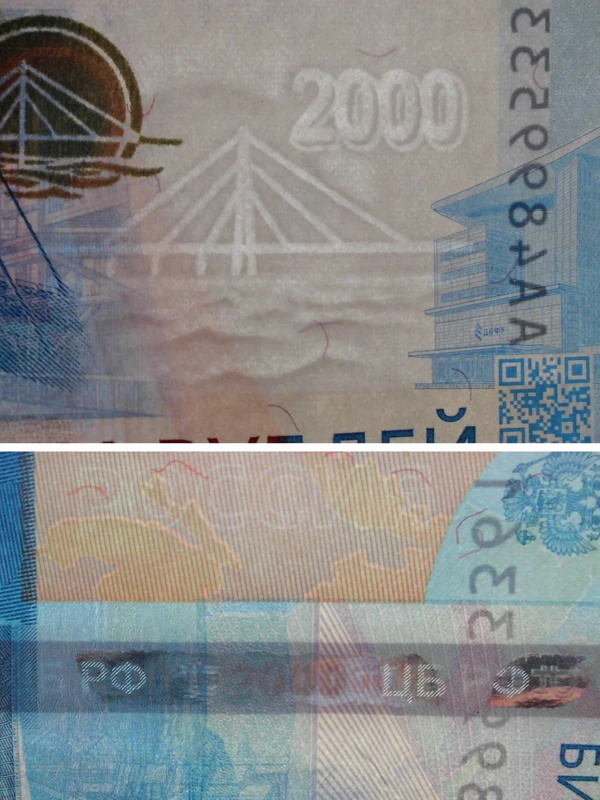 - на просвет: водяной знак с более светлыми и тёмными участками со стилизованным изображением Русского моста на фоне солнца и волн и номинал «2000», светлые надписи «ЦБ РФ» на тёмном фоне металлизированной ленты;