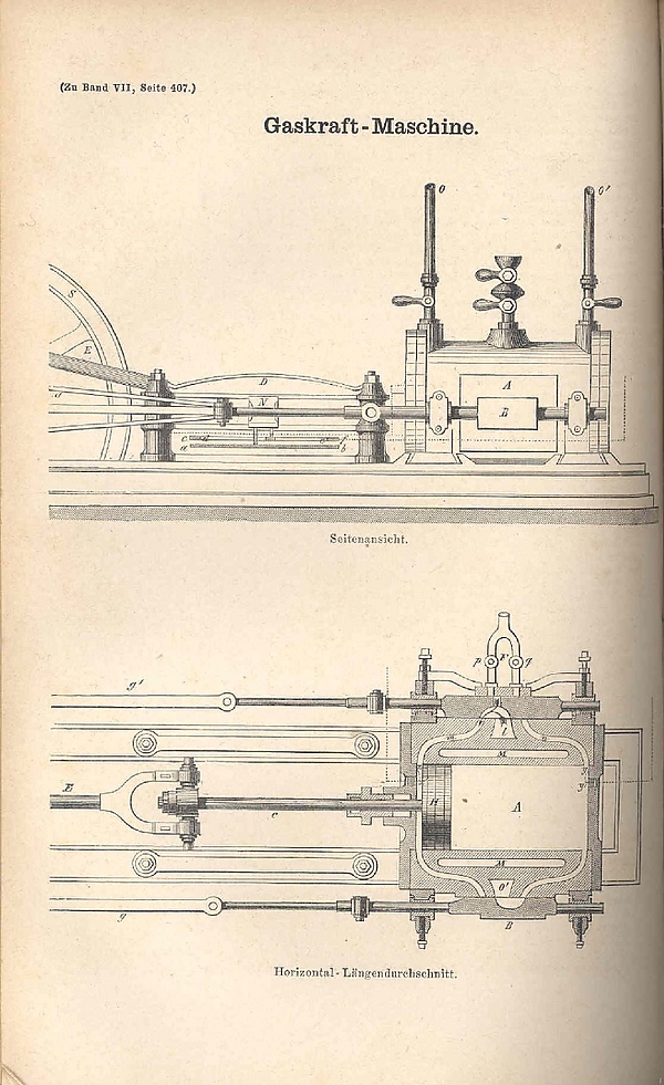На конструкцию одноцилиндрового двухтактного газового двигателя заметное влияние оказали технические решения, ранее использованные в паровой машине Уатта: поршень двойного действия (рабочими ходами являются и прямой и обратный), золотниковый механизм, управляющий подачей рабочего тела в цилиндр и удалением отработанного. Только рабочим веществом является не пар, а продукты сгорания смеси воздуха и светильного газа, вырабатываемого газогенератором.