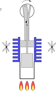 - Внешний источник тепла нагревает газ в нижней части теплообменного цилиндра. Создаваемое давление толкает рабочий поршень вверх (вытеснительный поршень неплотно прилегает к стенкам).
