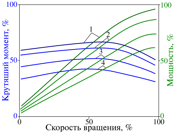 ДВС, отдающие мощность на выходной вал, обычно характеризуются кривыми крутящего момента и мощности в зависимости от частоты вращения вала (от минимально устойчивых оборотов холостого хода до максимально возможных, при которых ДВС может длительно работать без поломок)[36]. Дополнительно к двум этим кривым может быть представлена кривая удельного расхода топлива[37]. По результатам анализа таких кривых определяется коэффициент запаса крутящего момента (он же коэффициент приспособляемости), и другие показатели, влияющие на конструкцию трансмиссии[38].