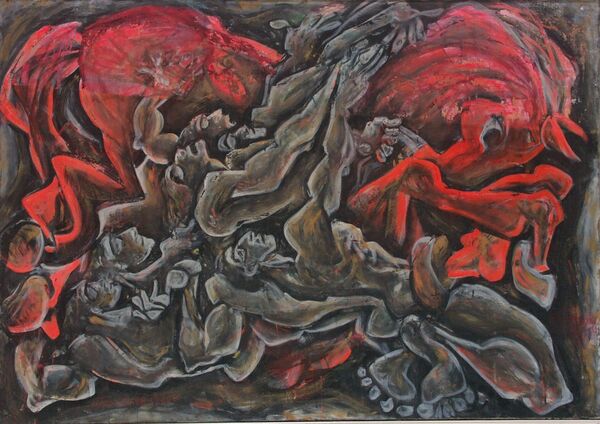 Полотно представляет собой многофигурную композицию, выполненную в экспрессивной манере с резко очерченными контурами. В центре изображены фигуры обнажённых людей в сложных ракурсах: их тела изогнуты назад, головы запрокинуты, а руки вытянуты вверх, что подчёркивает динамику и напряжённость сцены. На фоне центральной группы слева направо стремительно несётся лошадь, усиливая ощущение движения. Работа демонстрирует черты экспрессионизма.