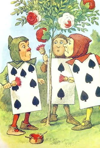– Понимаете, барышня, нужно было посадить красные розы, а мы, дураки, посадили белые. Если Королева узнает, нам, знаете ли, отрубят головы. Так что, барышня, понимаете, мы тут стараемся, пока она не пришла…