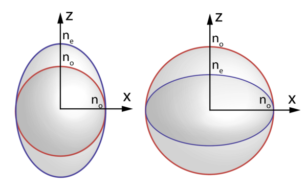 Чтобы уравнение 8 выполнялось, один из множителей должен быть равен нулю. Заметим, что первый соответствует уравнению сферы, а второй — поверхности эллипсоида в пространстве волновых векторов k для заданной ω. Первый множитель соответствует решению для обыкновенной волны, где показатель преломления равен no независимо от направления, а второй — для необыкновенного. Второй множитель соответствует решению для необыкновенной волны, где эффективный показатель преломления меняется от no до ne в зависимости от направления k. Для произвольного направления распространения волны возможны два вектора k, соответствующие двум разным поляризациям.