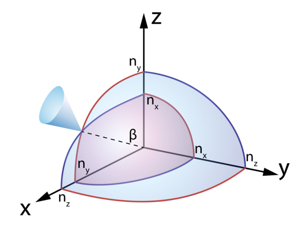 Первый множитель представляет собой эллипс, а второй — окружность. Аналогичное разложение можно проделать для всех трех плоскостей . На рисунке изображены сечения поверхностью трех координатных плоскостей в одном октанте, в остальных картина симметрична. Поверхность имеет 4 особые точки (точки самопересечения), в нашем случае лежащие в плоскости xz. Через эти точки проходят две оси , которые называются оптическими осями (либо бинормалями) двуосного кристалла. Только в этих направлениях волновой вектор может иметь единственное значение. Однако, в особой точке поверхности направление нормали является неопределенным, а лучевой вектор может заполнять коническую поверхность (конус внутренней конической рефракции)