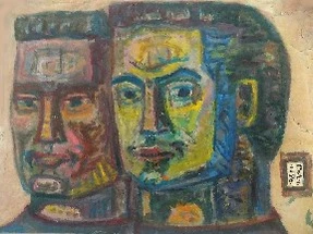 На картине представлен двойной портрет, выполненный крупным планом на бежевом фоне. Слева изображён более взрослый мужчина с тёмными волосами и глубоким взглядом, в образе которого преобладают тёмно-бордовые, розовые и синие оттенки. Справа расположен молодой человек с чёткими чертами лица, написанный в золотистых и синих тонах. Использование различных оттенков подчёркивает индивидуальные особенности персонажей и формирует выразительную цветовую гамму композиции.