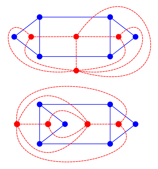 - Поскольку двойственный граф зависит от способа укладки, к одному и тому же планарному графу могут существовать несколько двойственных (неизоморфных). На рисунке красные графы не изоморфны, поскольку верхний имеет степень 6 (внешняя грань). Однако если граф 3-связен, как показал Уитни, укладка единственна, а потому и двойственный граф единственен[1].