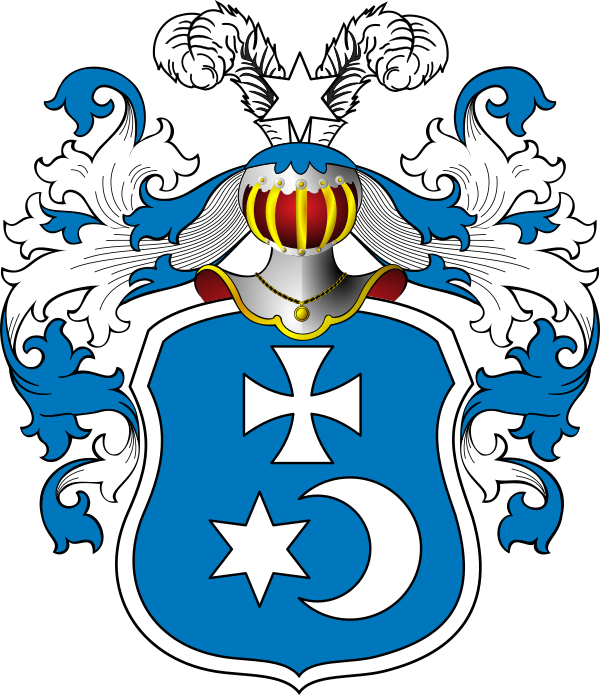 Щит увенчан дворянским шлемом, в нашлемнике такая же как в щите звезда и два страусовых пера; намёт голубой подложен серебром.