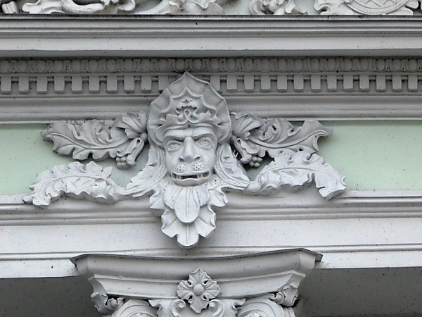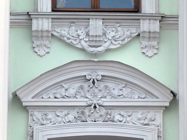 Парадный северо-восточный фасад особняка обращён к улице Фрунзе и в духе классицистических решений имеет трёхчастную симметричную фронтальную композицию, акцентом которой является четырёхколонный портик с капителями стилизованного коринфского ордера. Тему колонн портика в центральной части главного фасада продолжают пилястры коринфского ордера, украшающие пространство между окнами. Аналогичными пилястрами закреплены углы здания. Оконные проёмы флангов фасада сгруппированы в трёхчастные композиции, декорированы насыщенным лепным орнаментом. В уровне второго этажа расположены балконы с ажурным кованым ограждением. Пространство фриза украшено растительным орнаментом и маскаронами. Венчающий карниз подчёркнут рядом мелких дентикул. В уровне кровли здание украшено декоративными вазонами, которые установлены на декоративные тумбы с лепниной в виде венков. Парапет крыши представляет собой ажурные кованые решётки, расположенные между тумбами[1].