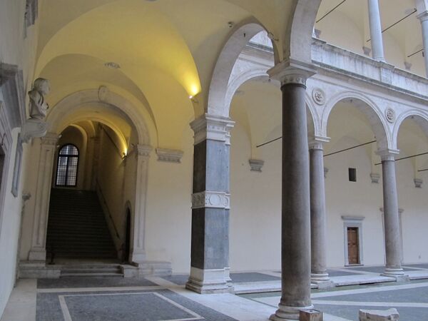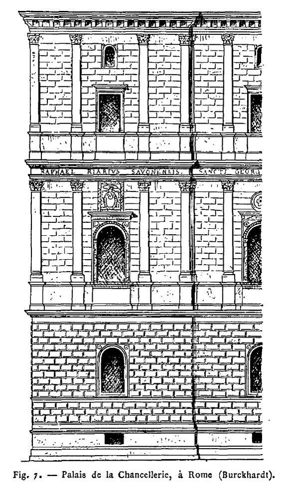Выдающимся произведением архитектуры римского классицизма является внутренний двор (кортиле) Палаццо Канчеллериа. Он оформлен А. Бреньо. Фасады разделены на три яруса, нижние два оформлены аркадами-лоджиями по флорентийской традиции, заложенной Ф. Брунеллески. 44 колонны нижнего яруса темного египетского гранита взяты из старой церкви Сан-Лоренцо, они, в свою очередь, происходят из Театра Помпея[9].