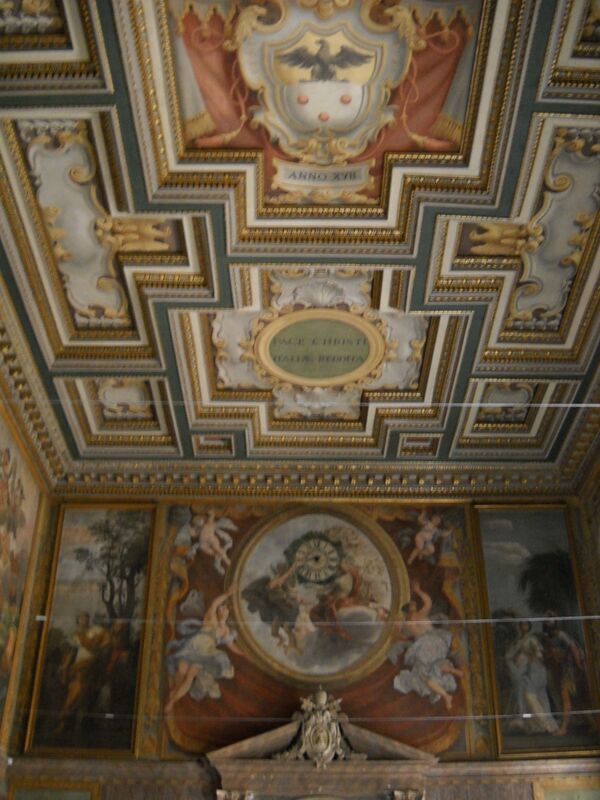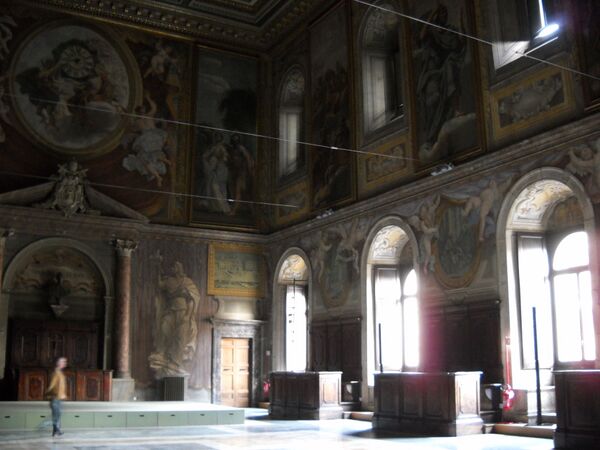 Интерьер здания включает Большой зал (Aula Magna) и так называемый Зал ста дней (Sala dei Cento Giorni) с росписями Дж. Вазари, якобы созданными за сто дней. Росписи изображают важное для Италии историческое событие: встречу Папы Павла III, императора Карла V и французского короля Франциска I в Ницце (в то время территория Савойского герцогства) в 1538 г.