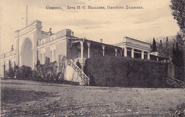 В 1895 году, на фундаменте сгоревшего в 1889 году Хрустального дворца по проекту молодого городского архитектора Ялты Н. П. Краснова был возведён пансион на 24 комнаты. В списке работ, представленных Красновым в 1913 году в Императорскую Петербургскую Академию художеств, указана «вилла-пансион г. Мальцева в Симеизе, исполненная в современном английском стиле». Здание изначально строилось для сдачи номеров отдыхающим (в основном, друзья и знакомые семьи). Со временем, поскольку дела по сдаче комнат шли не очень хорошо, пансион был сдан в аренду на несколько лет Н. К. Александрову-Дольник — успешному владельцу самого большого пансиона в Новом Симеизем[4][5].