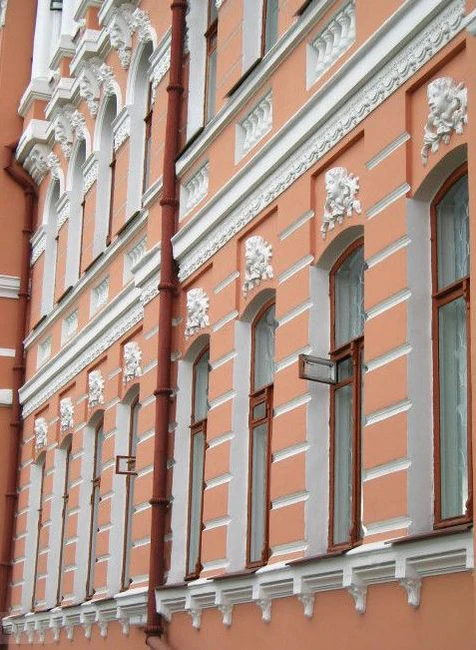 Поверхность обоих главных (уличных) фасадов, в том числе межэтажные тяги, обильно декорирована с использованием растительных элементов и маскаронов. В уровне первого этажа оконные проёмы имеют лучковую перемычку, в уровне второго и третьего этажей — полуциркульное завершение[1][4].