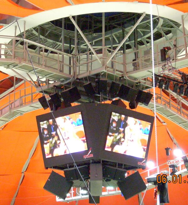 Всего в зале установлены шесть табло: два боковых, а также многофункциональный медиа-куб под куполом. Вдоль игрового поля расположено электронное табло, использующееся для демонстрации рекламы[1].