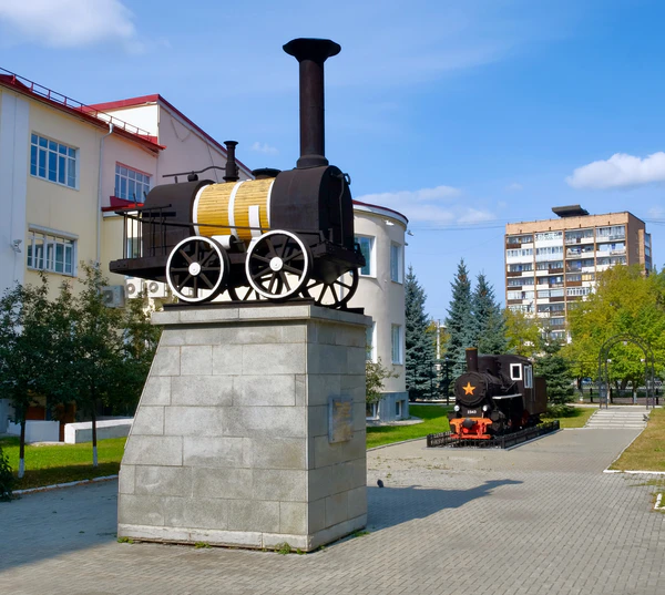 На территории клуба установлен монумент с именами железнодорожников, погибших в годы Великой Отечественной войны. В 2015 году была открыта композиция «С чего начинается Родина» скульптора Сергея Валентиновича Титлинова. На площадках около здания клуба вдоль улиц Свердлова и Челюскинцев установлены экземпляры военной и гражданской техники, в том числе паровоз Кч4-328, модель паровоза Черепановых, танк Т-72, боевая машина пехоты БМП-1, гаубица М-30[2].