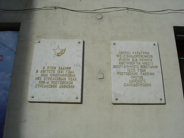 - «Дворец культуры железнодорожников имени В. И. Ленина построен на месте вооруженного восстания 1905 года ростовских рабочих против царского самодержавия»,