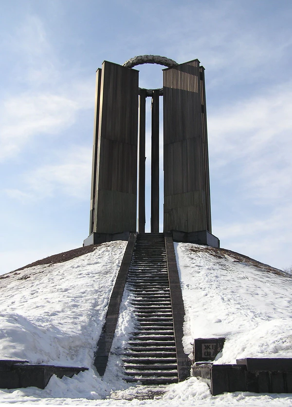 Памятник представляет собой три двенадцатиметровых пилона, которые объединены между собой бронзовым венком. Под холмом зеркально расположены еще три пилона-колонны. Наверх холма сделано пятьдесят ступенек. Между пилонами был расположен вечный огонь (зажигался только по праздникам, после развала СССР). В 2007 году вандалы разрушили вечный огонь, но затем он был восстановлен. Первоначально пилоны были облицованы красным гранитом, но со временем гранитные плиты стали отваливаться и облицовка была заменена на алюминиевый металлопрокат[6].