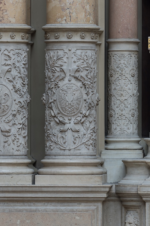Главное декоративное пространство дворца состоит из большого зала размером 31 х 15 метров, известного как «актовый зал» (нём . Aula) или «аркадный двор». Это обширный внутренний двор с портиком трёх высот: две из которых образованы большими арками, а верхняя — парами меньших арок, разделённых рельефными колоннами, увенчанными большими детально выполненными женскими бюстами, а между ними — богато украшенными панелями. На высоте 23 метра от земли простирается четырёхскатная стеклянная крыша, усечённая поверхностью, составленной из четырёх больших квадратных ниш.
