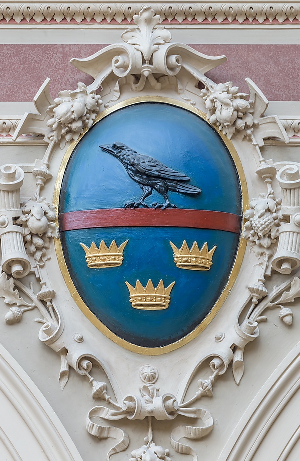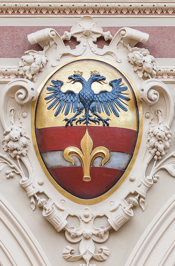 Ещё одним примечательным элементом комнаты являются красочные гербы, встроенные в пазухи сводов арок на первом этаже, представляющие королевства и территории, входившие в то время в состав Имперского совета (Рейхсрата), для которого Верховный суд сформировал совместную высшую судебную власть. Щиты, встроенные в перемычки арок, представляют собой образования, которые были частью имперской Австрии, распавшейся в 1918 году с разделением Австро-Венгерской империи, что привело к возникновению различных территориальных образований: Далмация, Карниола, Истрия, Каринтия, Силезия и Моравия, Богемия, Галиция и Лодомери, Верхняя Австрия, Нижняя Австрия, Тироль, Зальцбург, Штирия, Триест, Буковина.