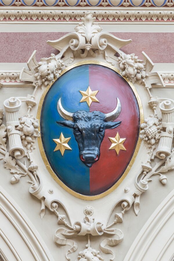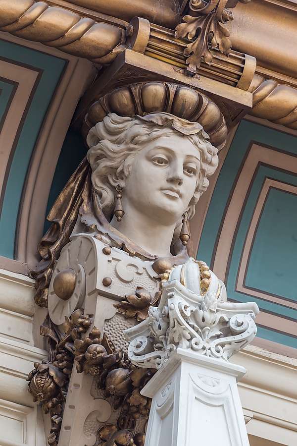 Главный вход в здание имеет внешнюю лестницу шириной 14 метров, которая проходит между четырьмя колоннами и ведёт в здание через три классических портала высотой около 5 метров, два из которых имеют полукруглый архивольт. Над дверями рельефно выделяются лица женщин в окружении гравюр с гроздьями винограда и др. По обеим сторонам лестницы на больших постаментах сидят две статуи львов в натуральную величину, смотрящие на парк, простирающийся перед зданием.