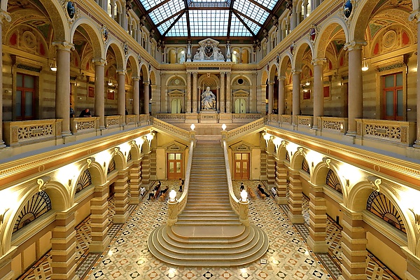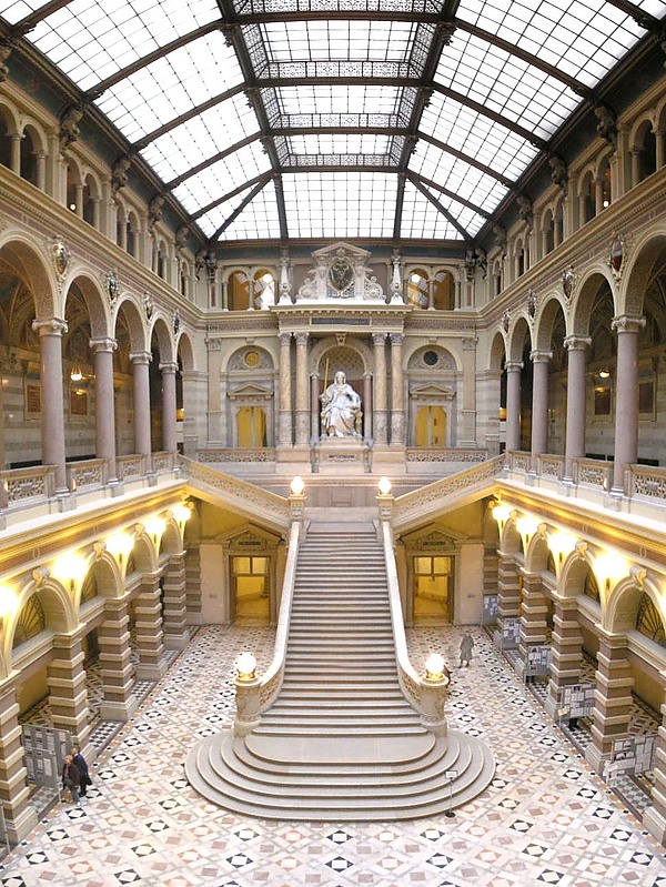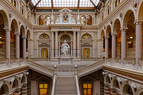 В центре помещения находится лестница, окаймлённая богато украшенными балюстрадами, за исключением нижней части, где ступени расширяются возрастающими окружными плоскостями по мере приближения к земле. Перед верхним концом лестницы, на втором этаже, находится знаменитая статуя богини Справедливости в сидячем положении, держащей в правой руке золотой меч правосудия, а в левой — раскрытую книгу законов. Фигура, высеченная из мрамора, восседает на троне в нише, окаймлённой двумя небольшими колоннами с ионическими капителями (на высоте головы статуи) и двумя парами более крупных колонн с коринфскими капителями, расположенными симметрично от статуи на двух пьедесталах немного выступающими вперёд, нижняя часть колонн украшена гравюрами из фитарии (орнаменты взятые из царства растений, собирательно называемые флорой или фитарией) и геральдикой. Эти четыре колонны поддерживают архитрав с надписью на латыне «FRANC IOS IDG AVSTRIAE IMPERATOR», которую можно перевести как «Франциск Иосиф I, император Австрии по милости Божией» — той самой, которая появляется на реверсе золотых монет, отчеканенных во время правления императора. Здесь и выше — величественное изображение австрийского императорского щита с символами домов Габсбургов, Лотарингии и Австрии, окружённое такими элементами, как императорская корона, головы львов, бюсты женщин и различные украшения.