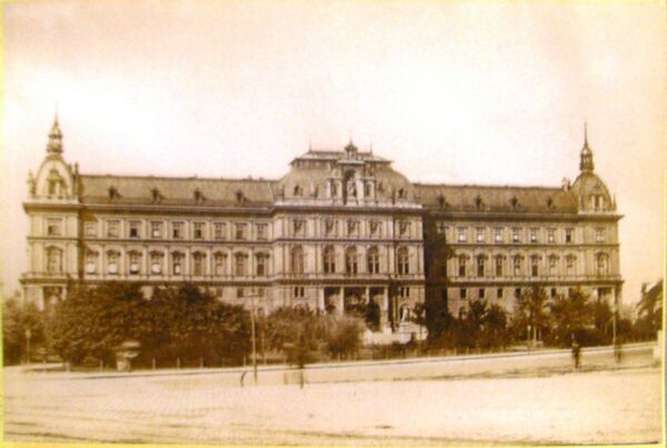 Здание, построенное между 1875 и 1881 годами по императорскому указу (от 4 сентября 1874 года) было спроектировано архитектором Александром Вилемансом фон Монтефорте, руководителями строительства были Пауль Ланге и Доминик Аванцо[5]. Два льва над наружной лестницей (нем. Freitreppe) и мраморная статуя Юстиции с позолоченным мечом и сводом законов принадлежат южнотирольскому скульптору Эмануэлю Пендлу (нем. Emanuel Pendl)[6].
