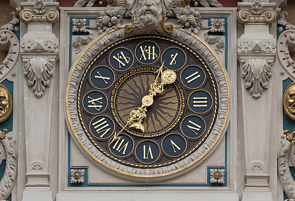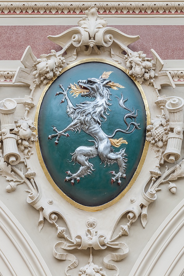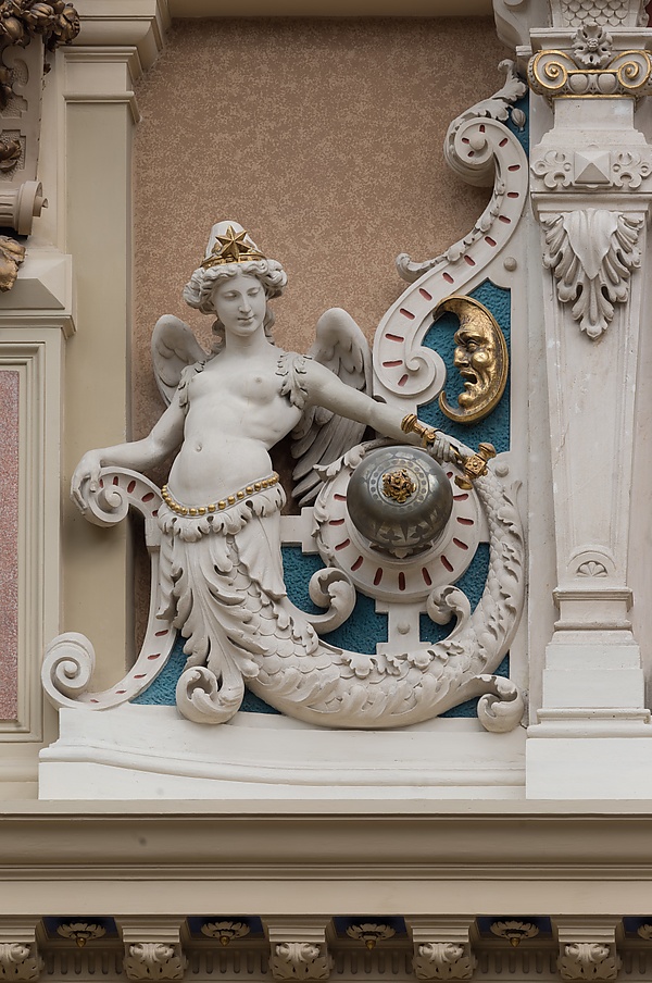 На другой стороне комнаты, наверху стены, обращённой к выходу, прямо над главной аркой первого этажа, находятся большие часы с римскими цифрами и двумя мраморными сиренами с каждой стороны. Часы увенчаны головой Хроноса (олицетворение времени), лицо которого также появляется в профиль на двух золотых лунах, смотрящих в сторону русалок. Многие из скульптурных фигур во дворце, в том числе русалки, Правосудие и львы на внешней лестнице, являются работами южнотирольского скульптора Эмануэля Пендла.