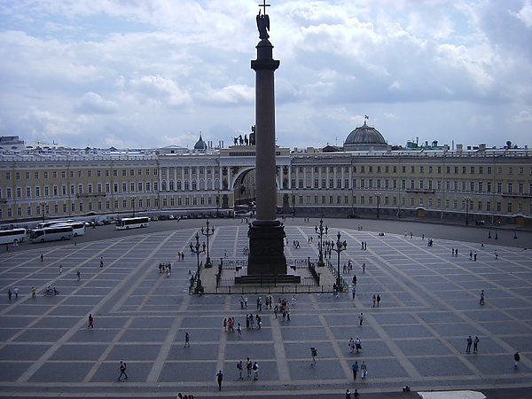 В 1837—1843 годах с восточной стороны Дворцовой площади на месте Экзерциргауза (1797—1798, архитектор В. Бренна) по проекту архитектора А. П. Брюллова построено большое здание штаба Гвардейского корпуса. В 1830—1834 годах в центре площади по проекту архитектора Огюста Монферрана была возведена Александровская колонна (фигура ангела выполнена скульптором Б. И. Орловским). Как и Триумфальная арка Главного штаба, памятник посвящён победам русского оружия в войне с Наполеоном[15].