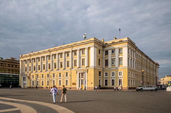 С востока ансамбль Дворцовой площади замыкает фасад здания бывшего штаба Гвардейского корпуса, построенного в позднеклассическом стиле по проекту архитектора А. П. Брюллова в 1837—1843 годах[49]. На этом месте с конца ΧVΙΙΙ века находилось здание Экзерциргауза, возведённое В. Бренной. Оно тянулось вдоль Миллионной улицы. В 1827 году был объявлен конкурс на проект строительства театра рядом с Экзерциргаузом, с единым «приличным» фасадом. Но затем от планов отказались.