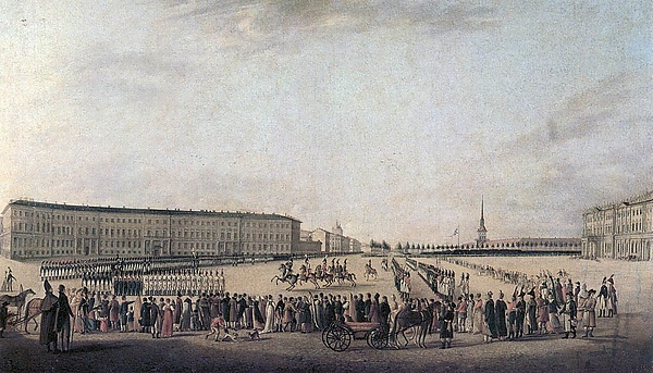 В 1810 году Александр I поручил архитектору Строительной комиссии Императорского кабинета А. А. Модюи разработку проекта регулирования и оформления территории перед императорской резиденцией Зимним дворцом, Адмиралтейского луга и Исаакиевской площади[11]. Представленные проекты были одобрены, однако началу реализации проектов помешало изменение международной обстановки. К реализации проекта реконструкции вернулись после окончания военных действий.