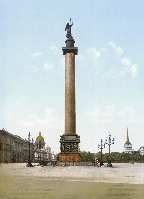 Воздвигнута в стиле ампир в 1834 году в центре Дворцовой площади французским архитектором Огюстом Монферраном по указу императора Николая I в память о победе его старшего брата Александра I над Наполеоном в Отечественной войне 1812 года[49].