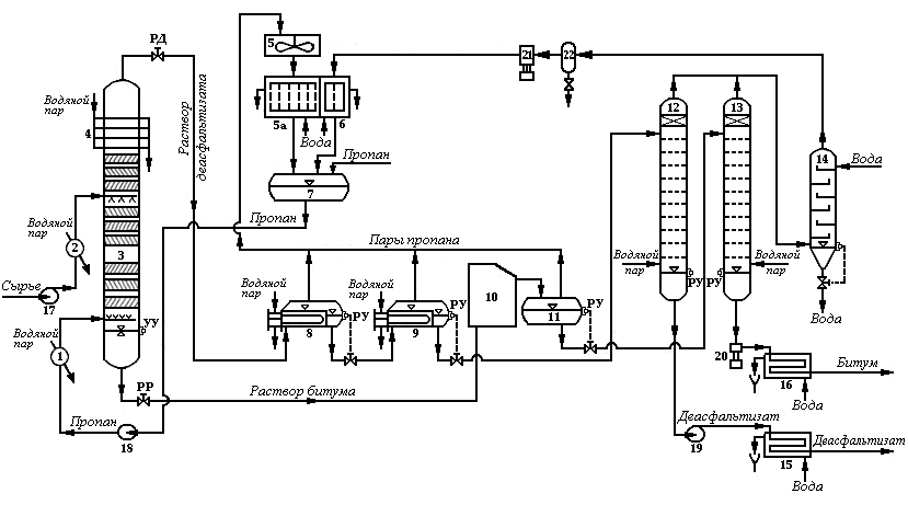 Сырье (нефтяной остаток) насосом 17 через паровой подогреватель 2 подается в среднюю часть деасфальтизационной колонны 3 (на некоторых установках перед входом сырья в подогреватель 2 вводят пропан, используя смеситель, чтобы избежать гидравлического удара)[6].