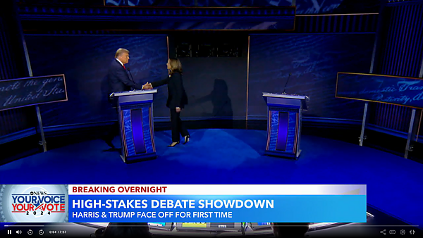 Поскольку Трамп обладал несколько бо́льшим опытом участия в предвыборных кампаниях, нежели Харрис, в ходе очередного раунда дебатов он держался увереннее. Зайдя в студию, не спешил поприветствовать оппонентку, но Харрис сама направилась в сторону Трампа, пожала ему руку, пожелав провести «хорошую дискуссию», на что тот ответил: «Да, конечно, развлекайся»[6]. В ходе полемики Харрис выглядела сосредоточенной и не отводила взгляд от Трампа, который говорил о ней в третьем лице и обращался при этом к ведущим. Работавшие в прямом эфире журналисты ABC News Дэвид Мьюир и Линдси Дэвис задавали вопросы кандидатам, называя Трампа «господином президентом», а Харрис — «госпожой вице-президент».