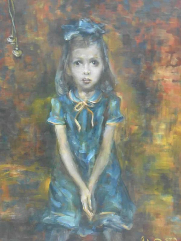 Картина представляет собой поколенный портрет девочки, сидящей в фас в голубом платье и с голубым бантом в волосах. Девочка отличается хрупким телосложением, тонким овалом лица и крупными тёмными глазами, направленными прямо на зрителя. Губы слегка припухлые, волосы доходят до плеч. Руки свободно лежат на коленях, поза отличается непосредственностью, колени разведены.