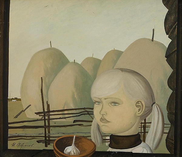 На картине представлен бытовой интерьер: справа у окна крупным планом изображена голова девочки со светло-голубыми глазами и двумя светлыми косичками. На подоконнике стоит коричневая глиняная чашка с головкой чеснока. За окном избы видны расположенные за изгородью стога сена, слева вдали — белая лошадь и два сарая.